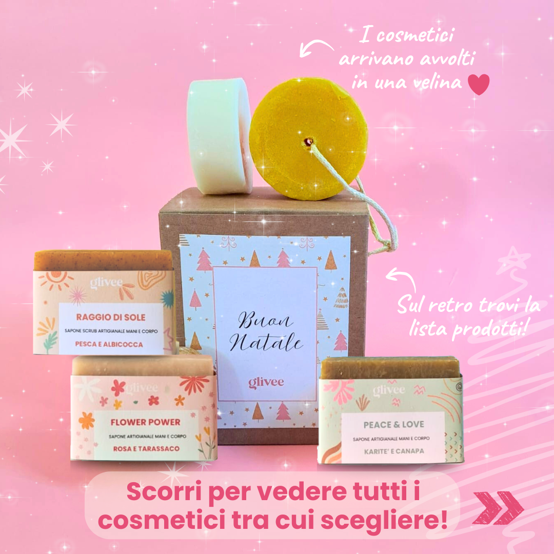 Contiene i nostri 3 saponi biologici e artigianali (2 idratanti e 1 effetto scrub) e 2 cosmetici a tua scelta: scrivici nelle note quali preferisci e noi li impacchettiamo per te! 🎅🏻